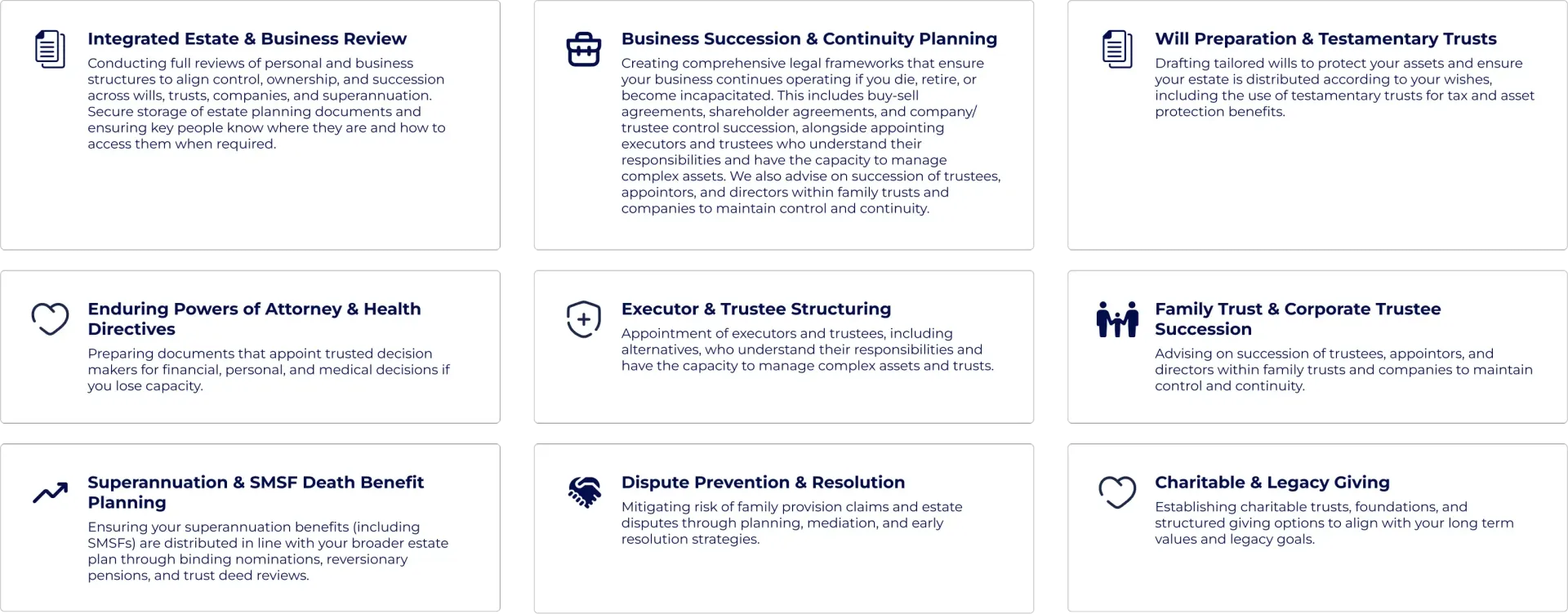 We review all aspects of your personal and business structures to ensure seamless integration.